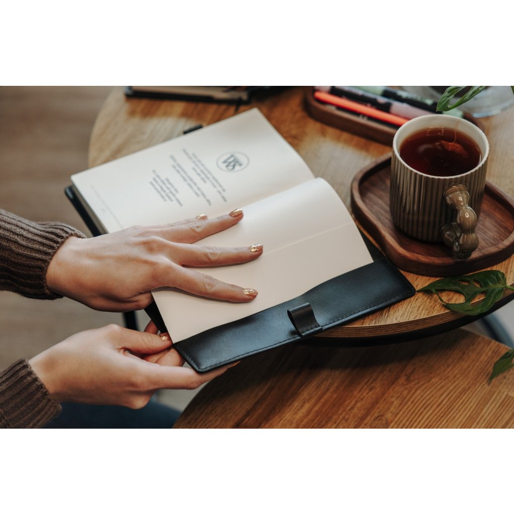 Elegantní a velmi promyšlený kožený obal na diář nebo knihu se zámkem pomocí propisky.