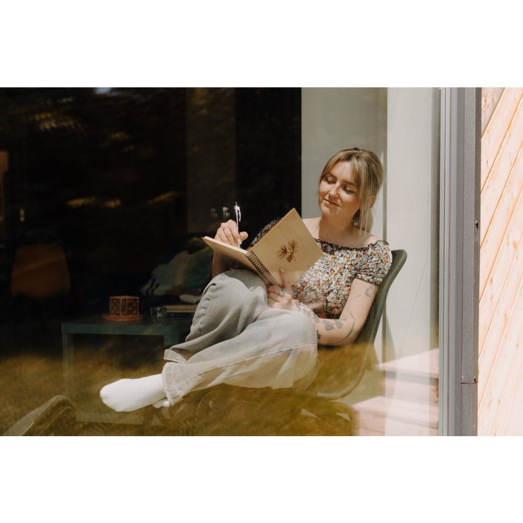 Dřevěný zápisník s kovovou kroužkovou vazbou.