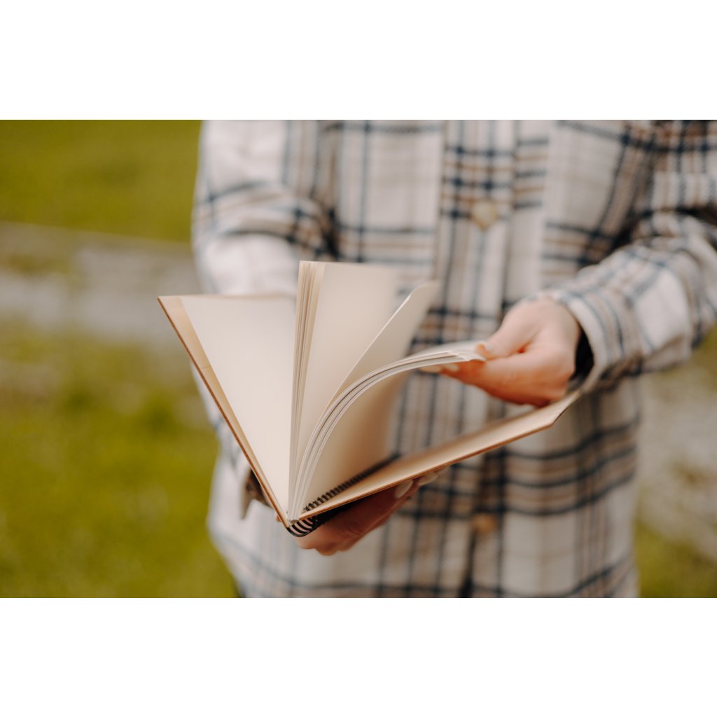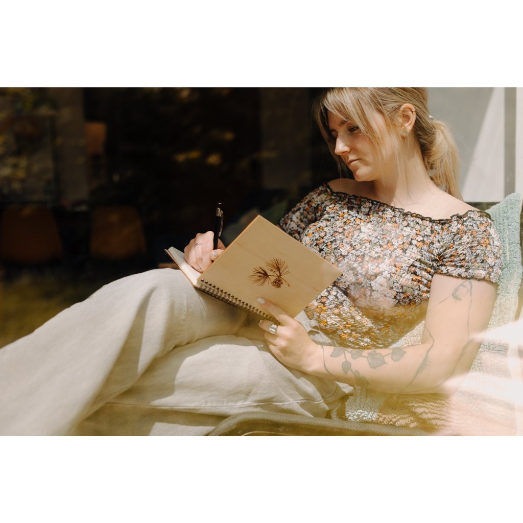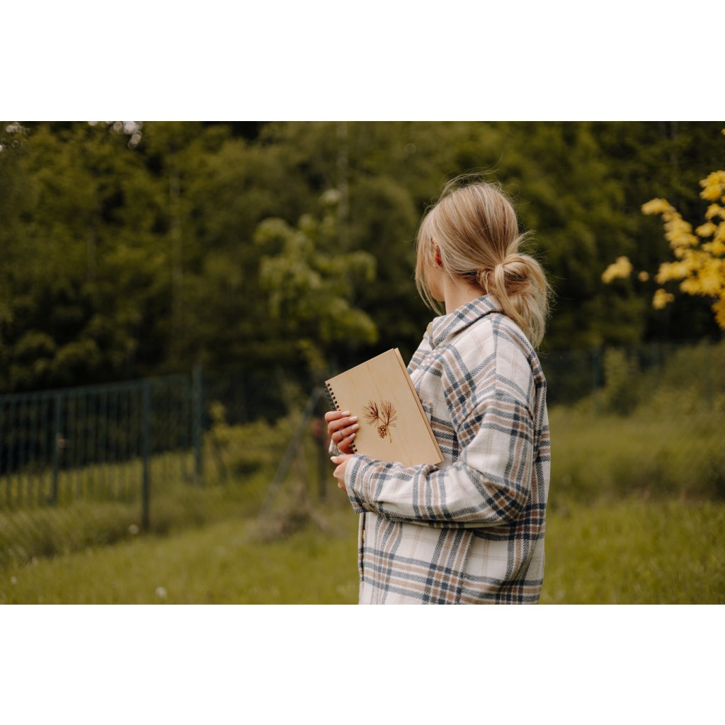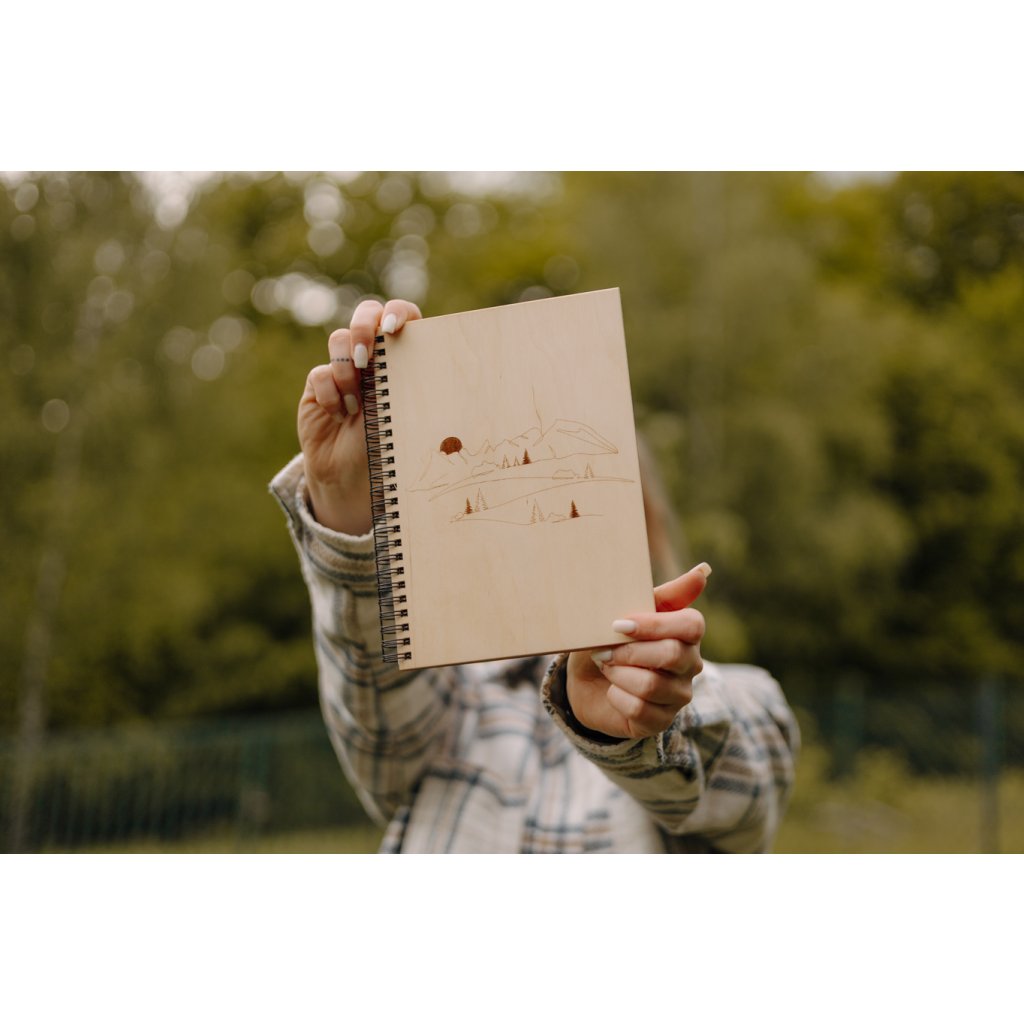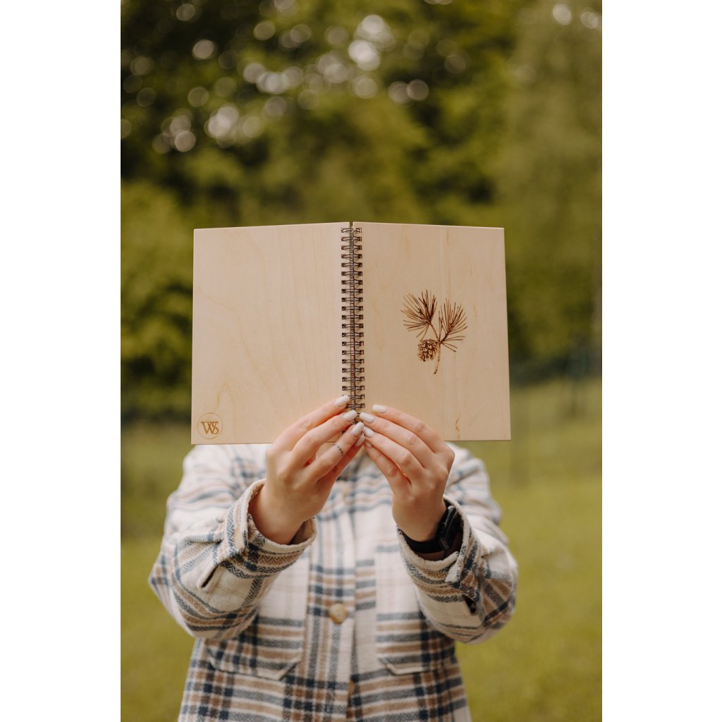 Dřevěný zápisník s kovovou kroužkovou vazbou.