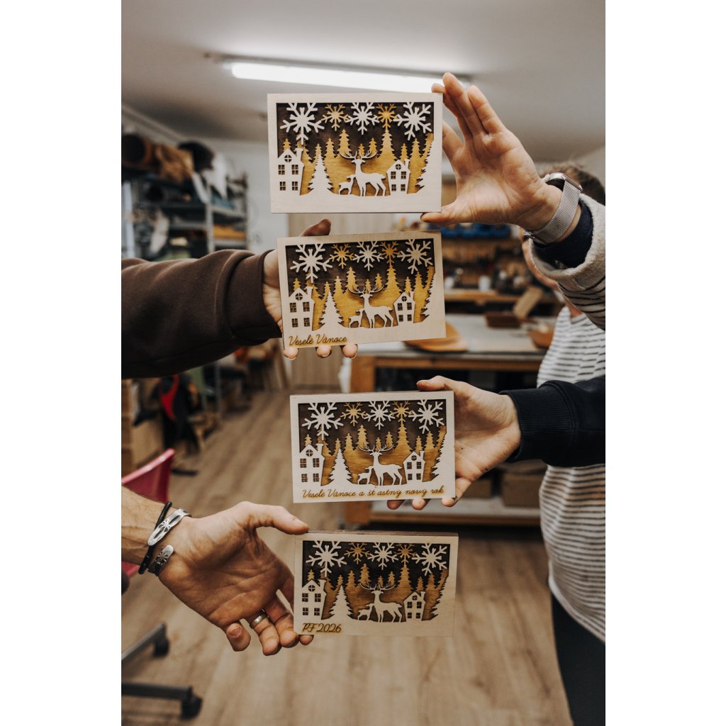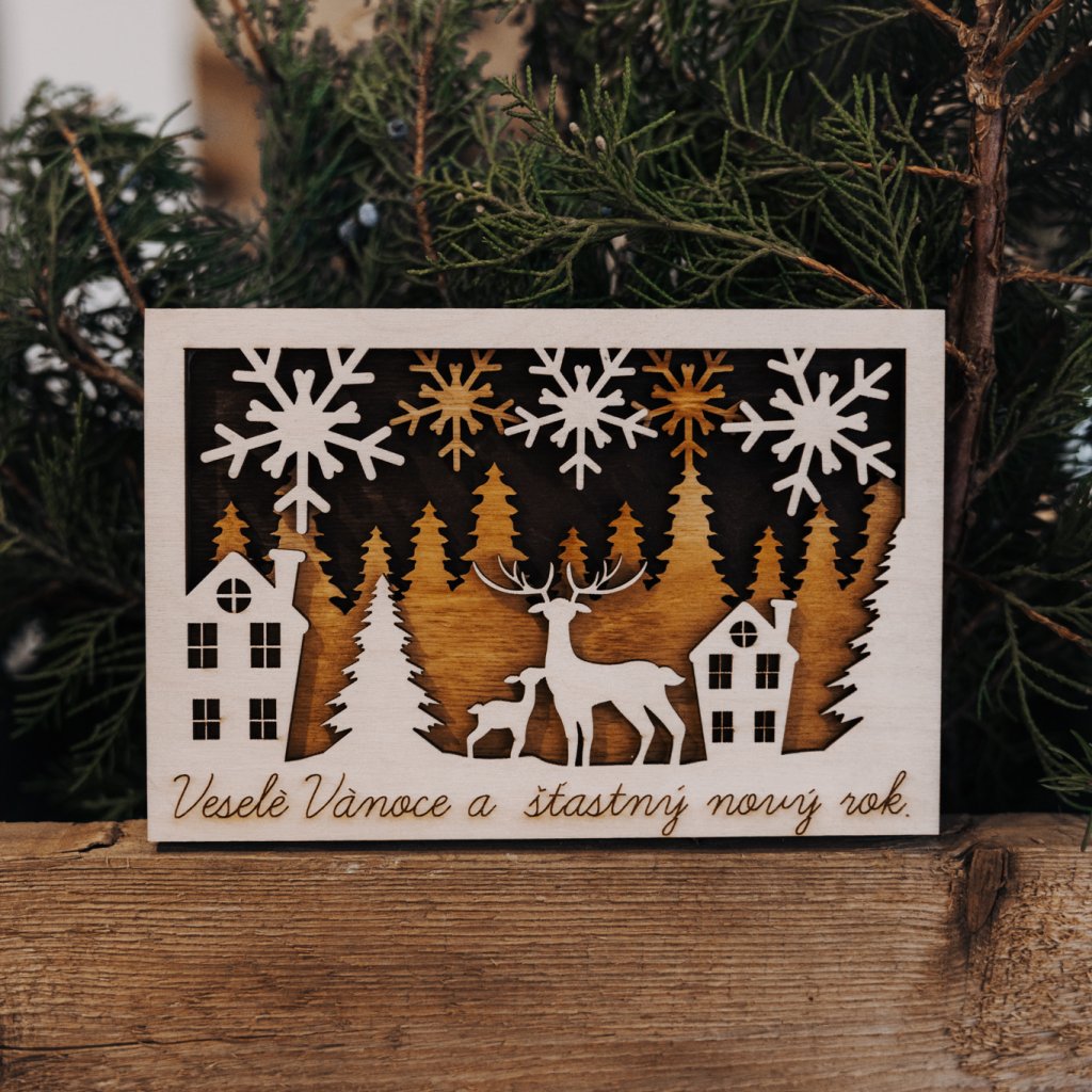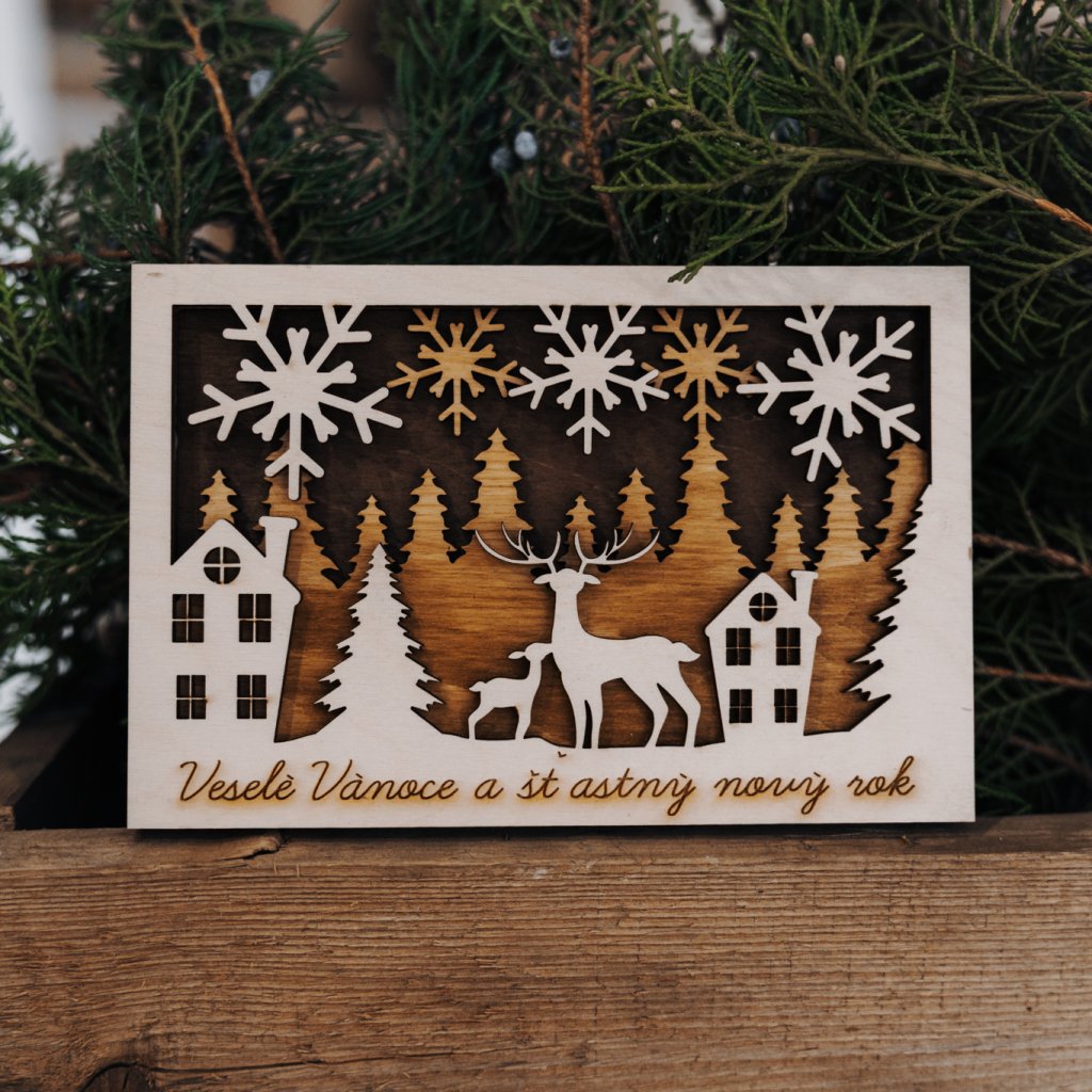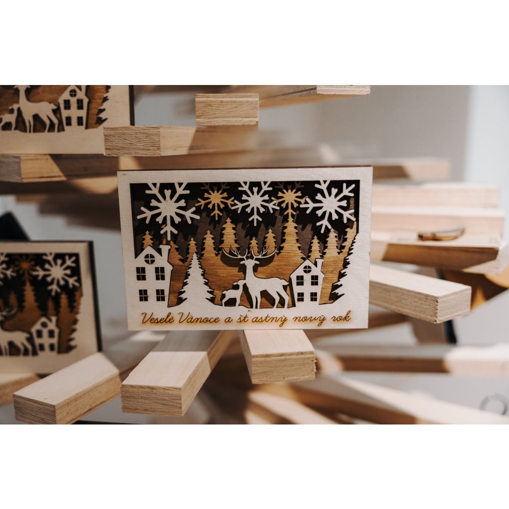 Darujte originální 3D vánoční přání z přírodního dřeva, které spojuje tradici s moderním designem.